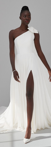 A bow at the shoulder is accented with a detachable chiffon streamer to create a touch of drama on the back. A seductive slit in the skirt completes this look.